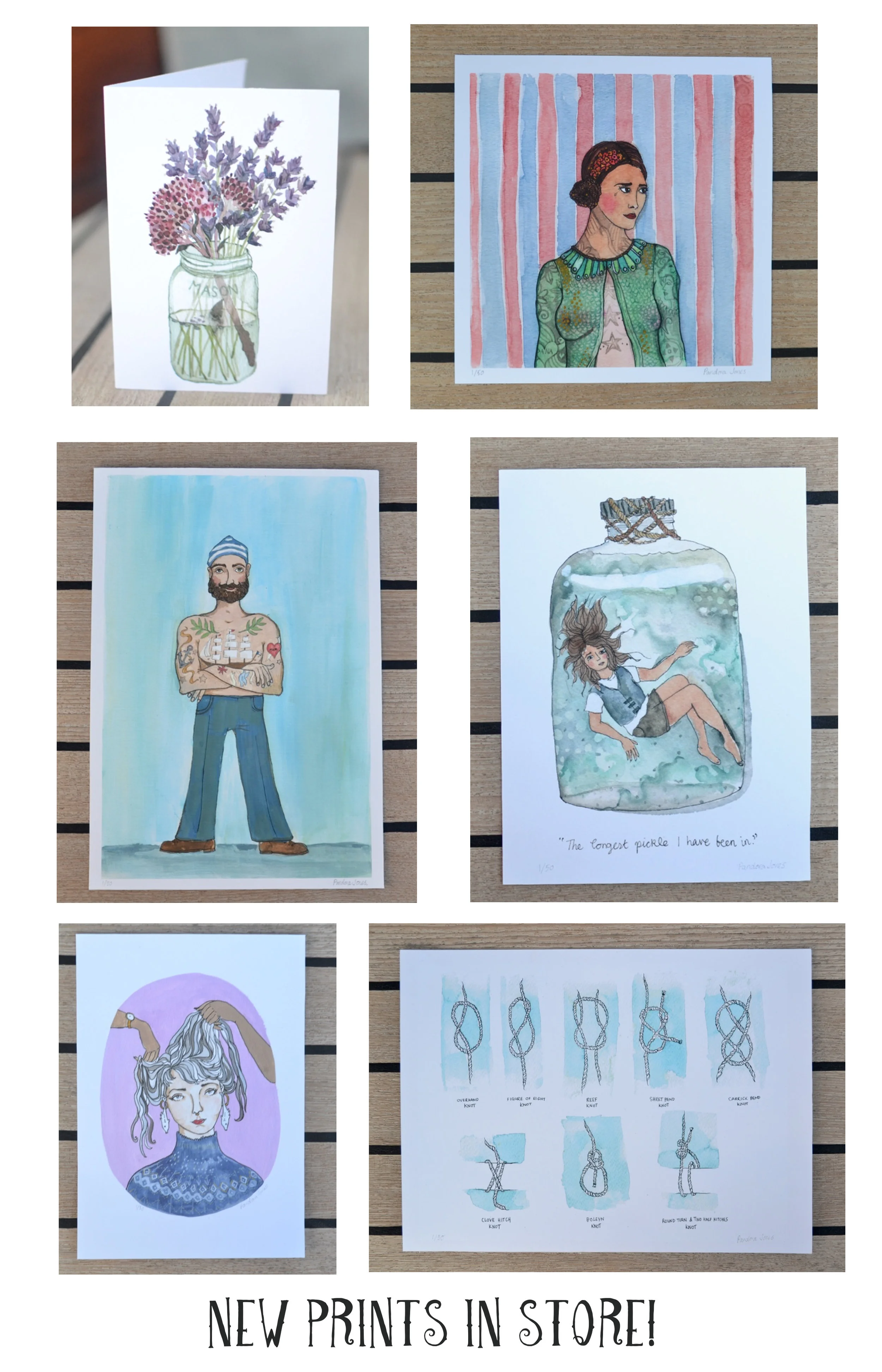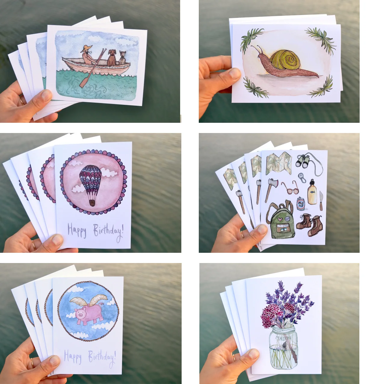 I have some new greeting cards up for sale in the shop. I was so happy with the positive feedback I received from my Mothers Day Cards. I have 6 different designs and they are printed on quality smooth card. They are perfect for upcoming birthdays, to say "thank you" to a friend or "You float my boat" to someone special! $11 usd for a pack of four. They make the perfect for someone who loves and appreciate whimsical art!